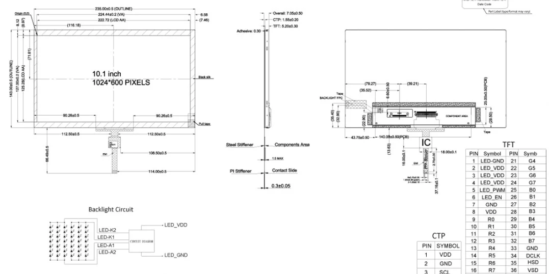 కేవలం 235mm × 143mm × 7.05mm మాత్రమే దీని స్లిమ్ కొలతలు కాంపాక్ట్ పరికరాలకు అనుకూలంగా ఉంటాయి. 3.3V ద్వారా ఆధారితం మరియు 40-పిన్ FFC కేబుల్ (CTP కోసం 6-పిన్ FFC) ఉపయోగించి, 10.1 అంగుళాల పారిశ్రామిక PCAP టచ్ స్క్రీన్ మాడ్యూల్ -20°C నుండి 70°C వరకు ఉష్ణోగ్రతలలో పని చేస్తుంది మరియు నిల్వ ఉష్ణోగ్రత పరిధి -30°C నుండి 80°C వరకు ఉంటుంది, ఇది కఠినమైన వాతావరణంలో కూడా నమ్మదగిన ఆపరేషన్‌ను నిర్ధారిస్తుంది.
