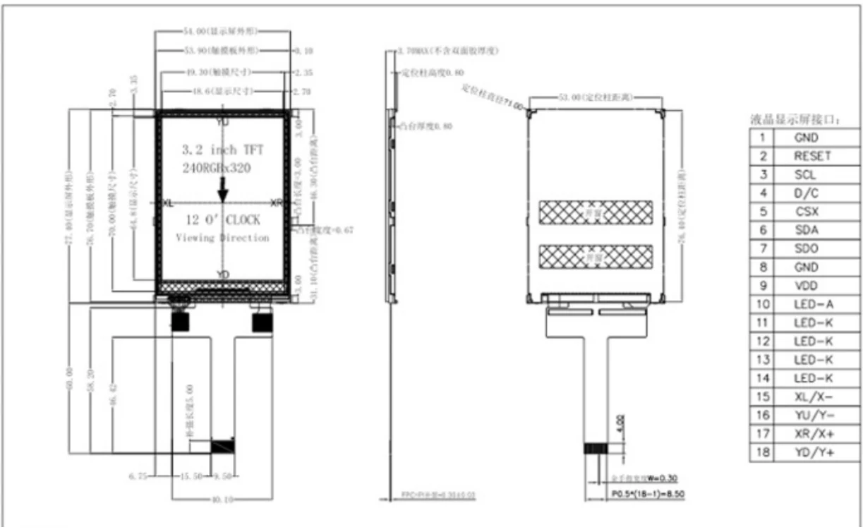 3.2 అంగుళాల వైడ్-టెంప్ IPS TFT స్మాల్ TFT టచ్ స్క్రీన్ మాడ్యూల్ 4-వైర్ SPI సీరియల్ ఇంటర్‌ఫేస్‌ను కలిగి ఉంది, ఇది వివిధ రకాల డిజైన్‌లలో ఇంటిగ్రేట్ చేయడం సులభం చేస్తుంది. దీని కాంపాక్ట్ కొలతలు 54.00×77.40×3.70 mm (W×L×D) స్పేస్-నియంత్రిత పరికరాలకు అనువైనది, అయితే దాని 48.60 × 64.80 mm యాక్టివ్ డిస్‌ప్లే ఏరియా డిస్‌ప్లే పరిమాణం మరియు పోర్టబిలిటీని బ్యాలెన్స్ చేస్తుంది, ఇది పారిశ్రామిక నియంత్రణ ప్యానెల్‌లు, హ్యాండ్‌హెల్డ్ టెస్టర్‌లు మరియు వినియోగదారు ఎలక్ట్రానిక్‌లకు ఆదర్శవంతమైన ఎంపిక.
